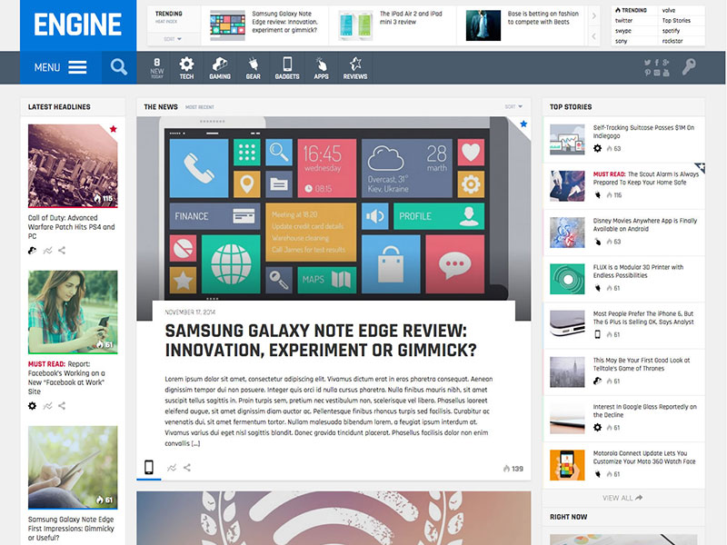 Additional features that make Engine an optimal magazine theme are Trending Topics (to identify and display your most popular posts), Comparisons (a one-click live comparing of posts/products on your site) and Reviews (to rate products and other items).