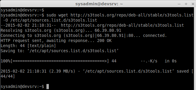 sudo wget http://s3tools.org/repo/deb-all/stable/s3tools.list -O /etc/apt/sources.list.d/s3tools.list