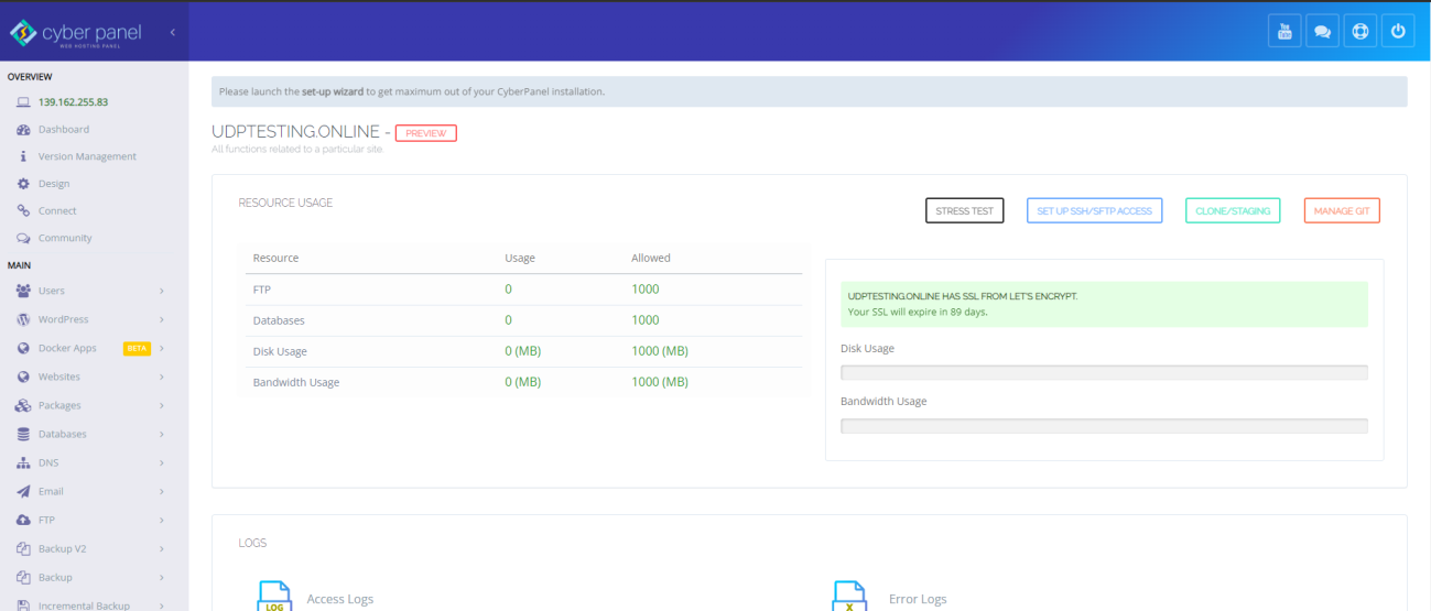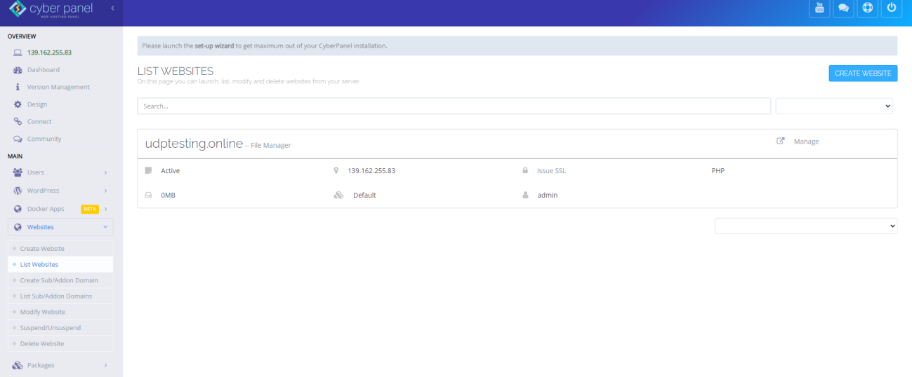 CyberPanel Successfully Installed Current Disk usage : 9/25GB (41%) Current RAM usage : 326/957MB (34.06%) Installation time : 0 hrs 7 min 0 sec Visit: https://139.162.255.83:8090 Panel username: admin Panel password: 9spyrAwMdc0jmCVT Run cyberpanel help to get FAQ info Run cyberpanel upgrade to upgrade it to latest version. Run cyberpanel utility to access some handy tools . Website : https://www.cyberpanel.net Forums : https://forums.cyberpanel.net Wikipage: https://docs.cyberpanel.net Docs : https://cyberpanel.net/docs/