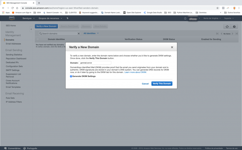 – If you are in Brazil and already use an AWS service, it is possible that your region is marked as São Paulo, and if this is the case you will see an alert: – “Simple Email Service is not available in South America (São Paulo ). Please select another region. ”.