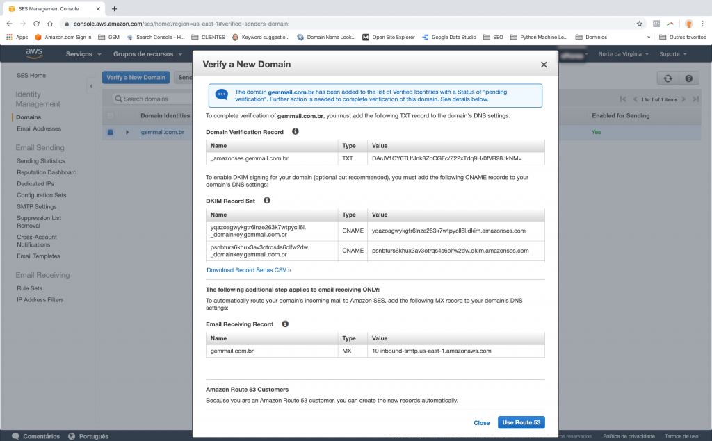 You will need to enter this data in your hosting provider’s DNS settings to validate your domain, otherwise the Verification Status: “pending verification” will appear on the SES panel. As long as the status is unchecked, emails cannot be sent.